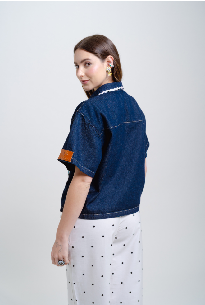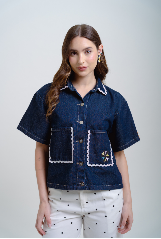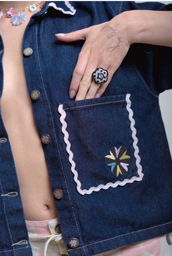 Esta silueta de chaqueta manga corta se ha convertido en statement para Ocarina, sabemos que les encanta por su versatilidad y comodidad. La nueva chaqueta Bloom, con la misma silueta boxy que te gusta, en un color dark denim que con los accesorios correctos puede verse elegante o casual. Le agregamos unos detalles que la hacen muy única, el bordado en el bolsillo y los sesgos decorativos ¡Amamos!